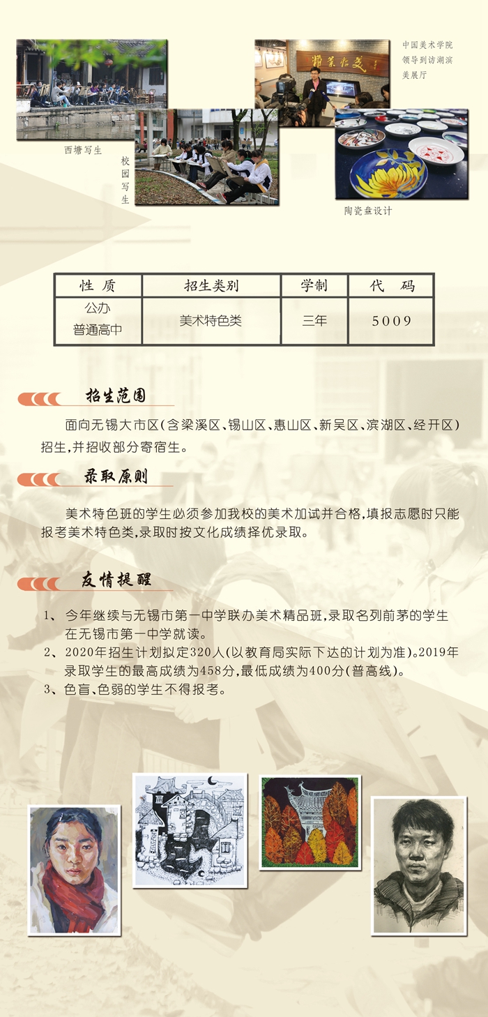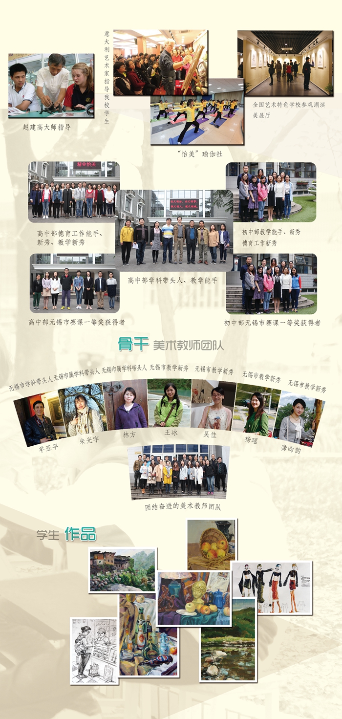 答:我校建有一支教育理念先进、结构合理、年富力强的师资队伍。学校以“精业、怡美”为校训,形成了“团结、勤奋、求实、创新”的校风。现有市(区)级以上骨干教师47名,占专任教师比例为26.3%,其中学科带头人6名,教学能手7名,教学新秀27名,班主任工作能手5名,班主任工作新秀10名。学校管理严格,教师爱岗敬业,积极进行教育教学改革,潜心因材施教,教学质量逐年稳步提高。美术学科有以市学科带头人和教学能手为首的中青年骨干教师共26名,另有清华大学、中央美院、鲁迅美院、南师大、南艺等专家组成员来我校授课。我校是江苏省美术课程基地、无锡市美术教学基地,以羊亚平为名师的无锡市中小学名师工作室(美术学科)在我校成立,为全市美术师资不断提升创造了一个高大的互动平台。经过多年的锤炼,我校美术学科已积累了丰富的教学经验,对各类高校的专业考试情况有较清楚的了解,应对有力。专业教师中有三名国家级美术专业委员会会员,100%参加过清华大学、中央美院、中国美院的教师专业进修。学校现拥有共计7000m²的专用画室60个,是全省专业教学设施设备最先进、最齐备的中学。学校与省内外100多所高校保持着密切联系,这为更好地指导学生提供了有利资源。