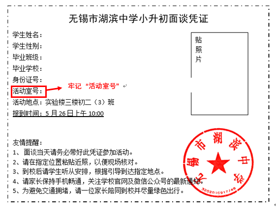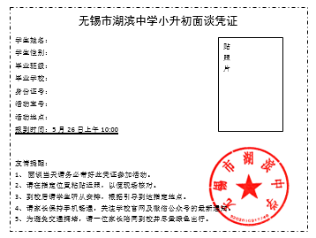 (1)学生需凭我校发的《无锡市湖滨中学小升初面谈凭证》进入校园参加面谈活动,并注意全程携带该凭证。请勿携带手表、手机等电子产品进校。