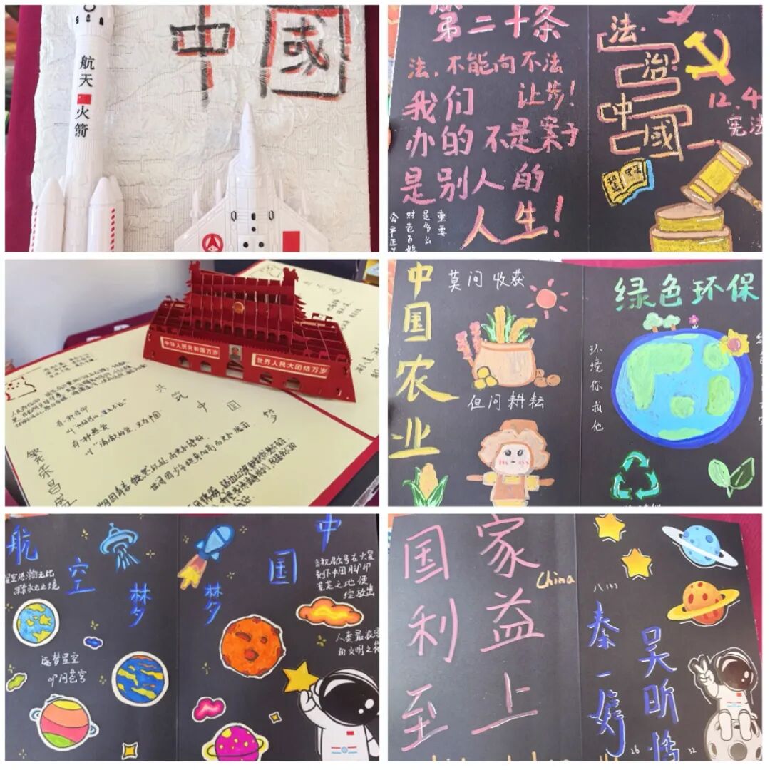 从“航天火箭”腾飞于纸端,到“宪法条文”庄严书写;从“绿色环保”的生态愿景,到“国家利益至上”的铿锵誓言——同学们用画笔勾勒出他们心中的大国图景。一幅作品,就是一个视角;一种色彩,就是一种态度。他们在构图间思考法治的意义,在涂鸦中理解环保的责任,在文字里感悟家国的分量。