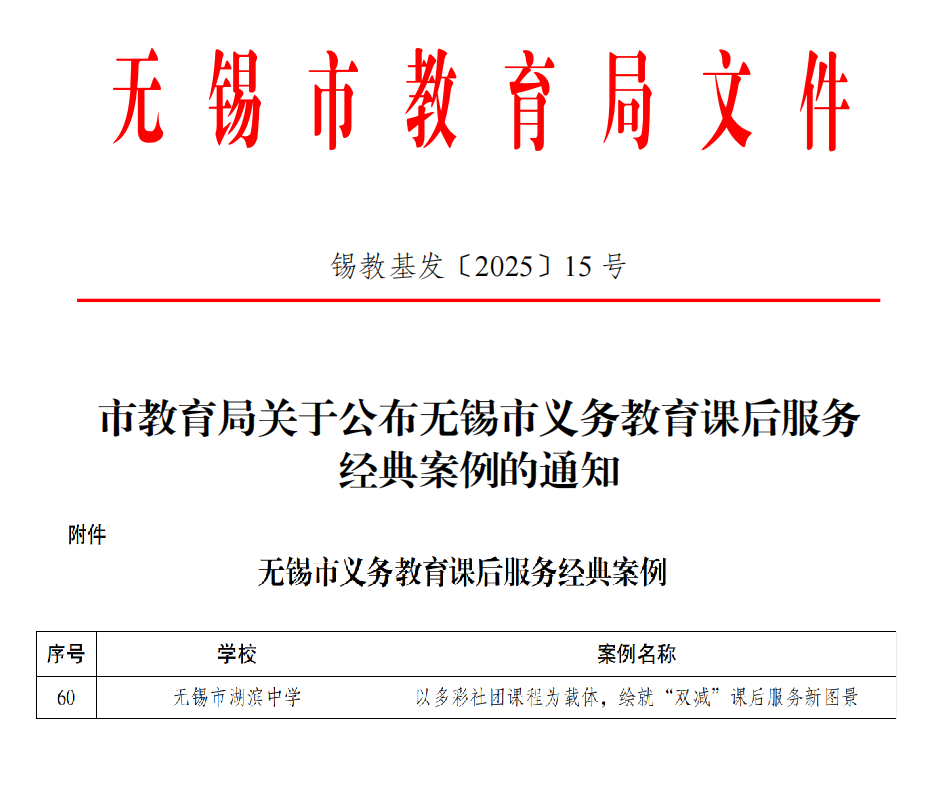 近日,无锡市湖滨中学初中部喜报传来:《以多彩社团课程为载体,绘就“双减”课后服务新图景》案例成功入选无锡市义务教育课后服务经典案例!