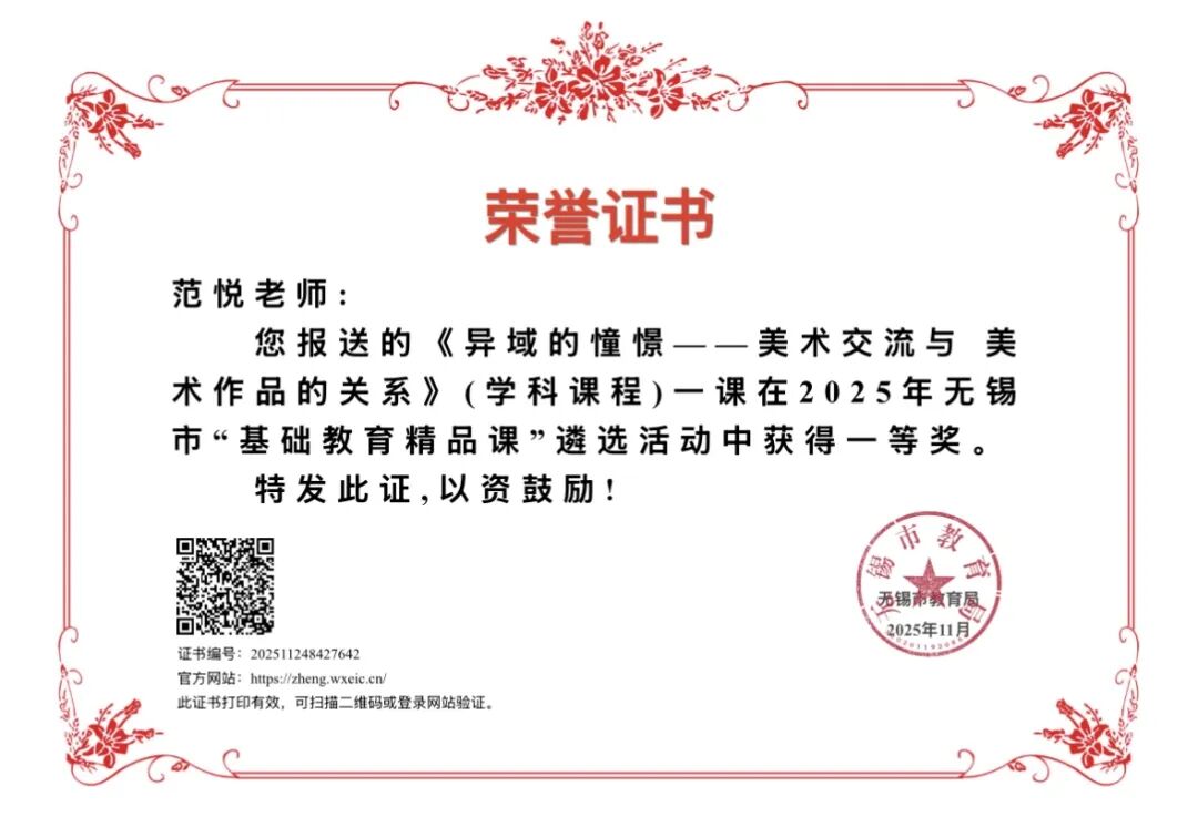 2025年,艺教处紧紧围绕学校“怡美”教育理念与“怡美”四有好教师团队建设规划,依托“课程创新、资源赋能、品牌辐射、交流协作”四维支撑,系统推进艺术课程建设、教学资源整合、师生素养提升与校家社协同发展。一年来,我们秉持“守正创新”的初心,通过“课标引领、项目驱动、实践赋能、协同共进”的多元路径,初步构建了“全员参与、全程渗透、全面发展”的美育新格局,为学校高品质特色发展注入了鲜活的艺术动能。近期荣获无锡市优质学科组培育建设对象(五星级)称号,这一里程碑式的认可,也为学校美育工作注入了强劲动力。