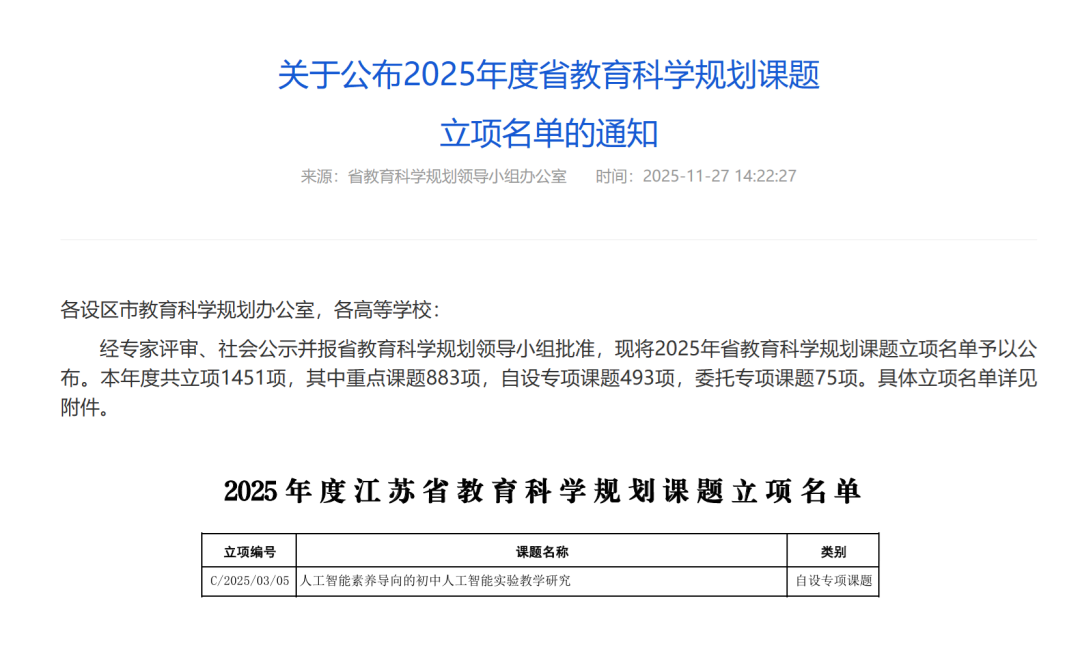 信息技术学科组牵头开发《实践导向的人工智能创新工程课程》,获评市级优质课程,团队教师在各级教学竞赛中屡获佳绩,其中郭晓然老师的课例获评全国中小学人工智能教育展示优秀示范课。省级课题《人工智能素养导向的初中人工智能实验教学研究》,将前沿技术融入日常教学,整合多学科资源,打造工程教育特色课程体系,助力学校成功入选 “无锡市义务教育教学改革实验校”,为拔尖人才培养提供坚实支撑。