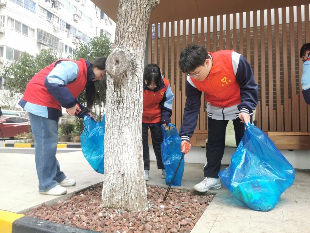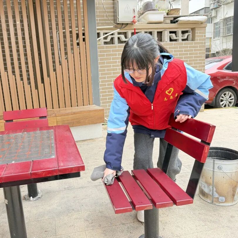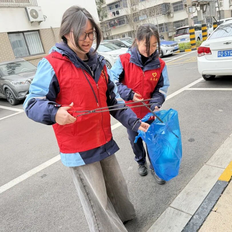 高中部志愿者小分队走进了锡山新村社区。他们仔细擦拭便民座椅和健身器材,不放过任何污渍;另一组同学化身“小区猎人”,用垃圾钳沿绿化带搜寻烟头、塑料袋,让环境焕然一新。
