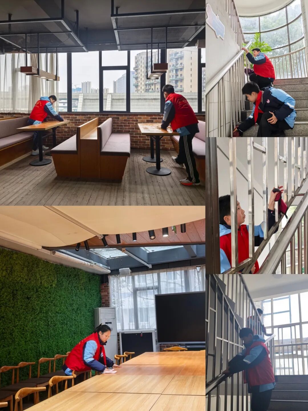 课后,初中部“小雷锋”迅速集结。操场上,他们弯腰捡拾草丛里的纸屑枯叶;花坛边,小心清理杂物不伤花草;橱窗旁,踮脚擦拭玻璃直到明亮如镜;楼梯扶手和墙角也被细心清扫。