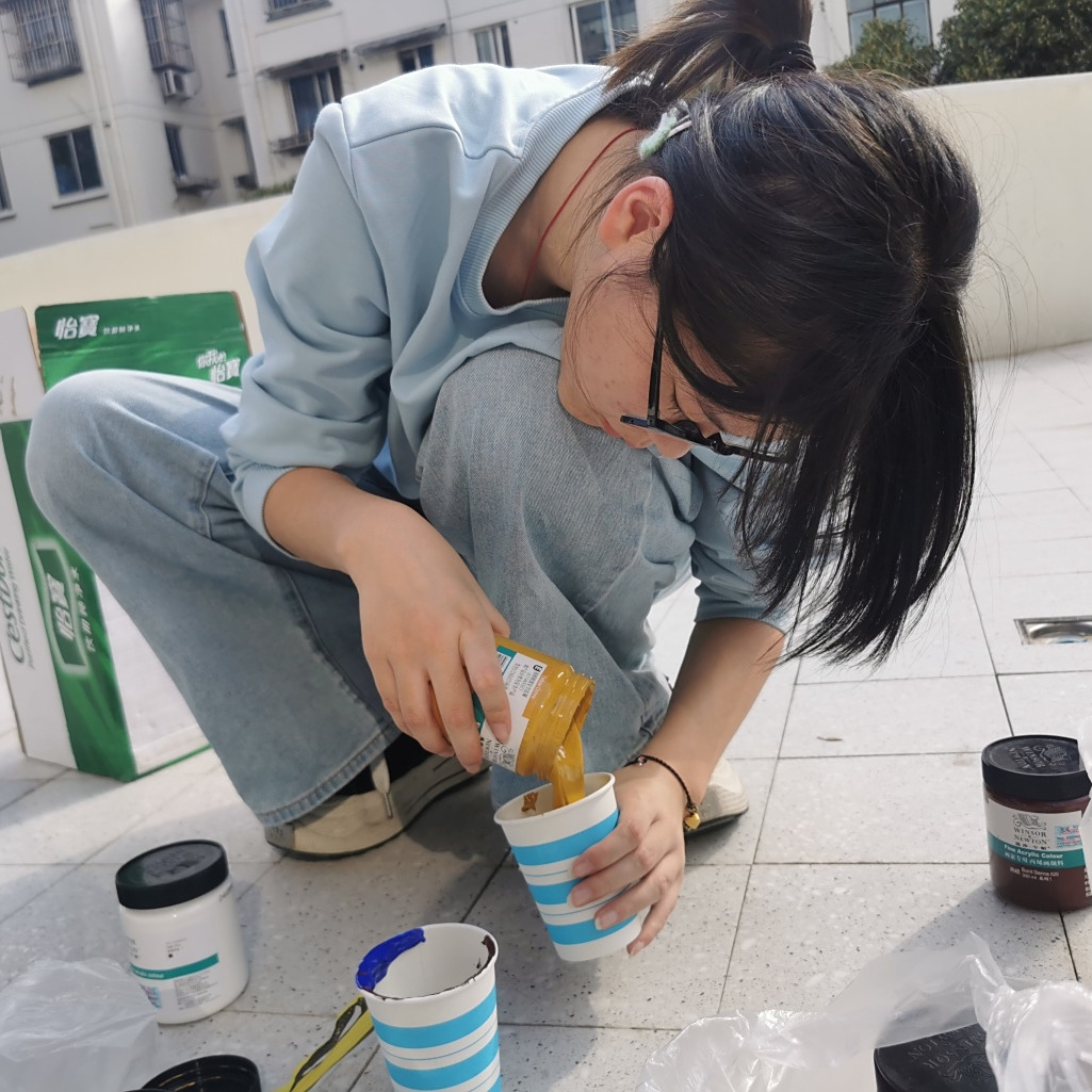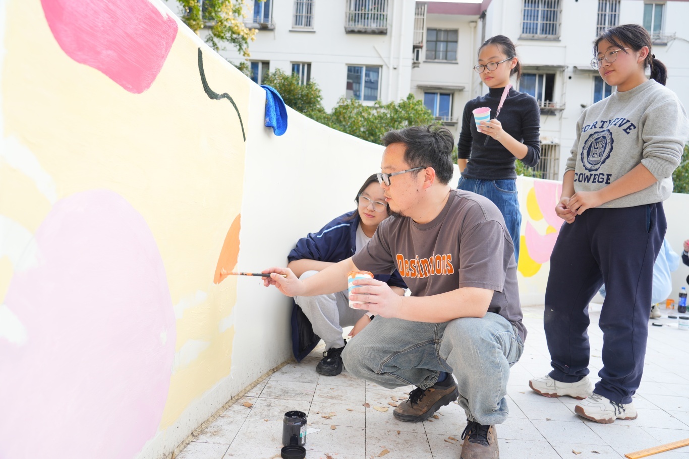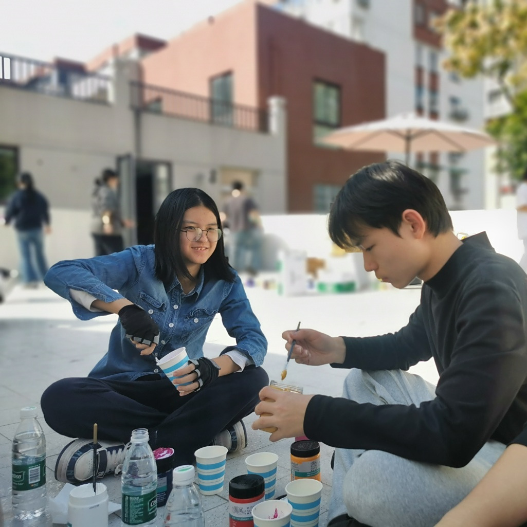 活动当日,同学们化身“社区美容师”,投入了紧张而有序的“劳动创作”中。搬运颜料、清理墙面、精心勾勒、反复涂刷……这不再是轻松的纸上挥毫,而是对体力与协作能力的综合考验。秋日的阳光下,颜料沾染了双手,但同学们的热情却愈发高涨。