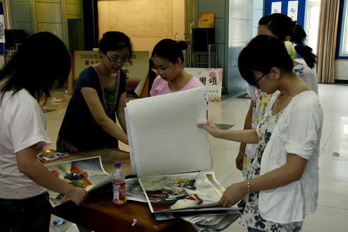 本次书画展经过两个多月的精心筹备,各市属学校师生积极参与,共收到作品369幅,其中有湖滨中学选送的108幅参展作品。为保证活动的顺利举行,学校总务部门在短短5天时间内,对布展场地进行了重新粉刷、油漆和清洗,确保了参展环境。9月7日,市属学校所有的参展作品运抵学校。王晓刚校长、薛仲延书记、顾祝亚副校长亲临现场,对布展工作提出了具体的要求和建议。在艺教处羊亚平主任的带领下,学校全体美术教师利用课余时间分工合作,同心协力,在2天内完成了2个场地所有作品的布展工作。几位即将赴高校报到的应届毕业生也加入了布展行列,他们是回母校向老师告别时得知这一活动的。